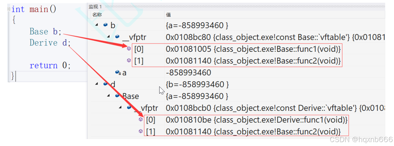 // 思路:取出b、d对象的头4bytes,就是虚表的指针,前面我们说了虚函数表本质是一个存虚函数