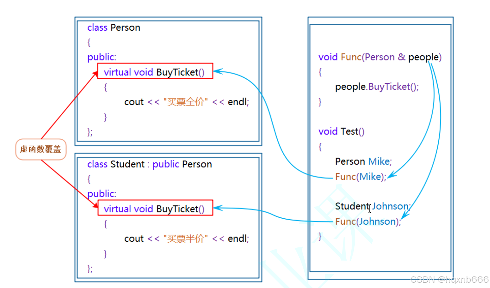 - 重写(覆盖,Overriding):派生类函数覆盖基类中的虚函数,函数签名(包括函数名和参数列表)完全相同。