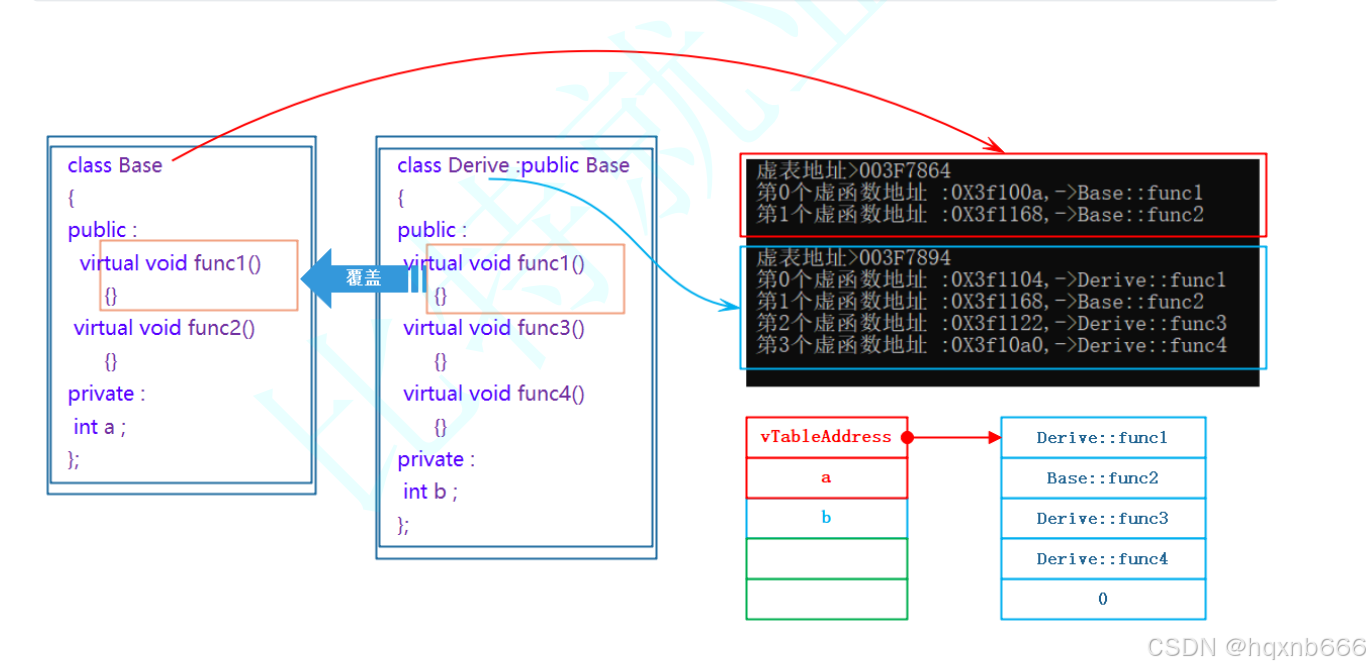 public:virtual void func1() {cout << "Derive::func1" << endl;}virtual void func3() {cout << "Derive::func3" << endl;}