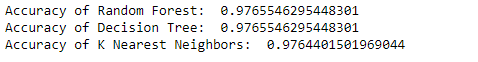 print("Accuracy of Decision Tree: ", score_dc)from sklearn.neighbors import KNeighborsClassifier
