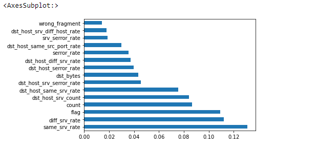 但是,根据条形图,我们绘制了最重要的七个特征,分别是 diff_srv_rate、same_srv_rate、dst_host_same_srv_rate、flag、count、dst_host_srv_count 和 dst_host_srv_serror_rate。
