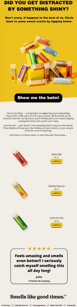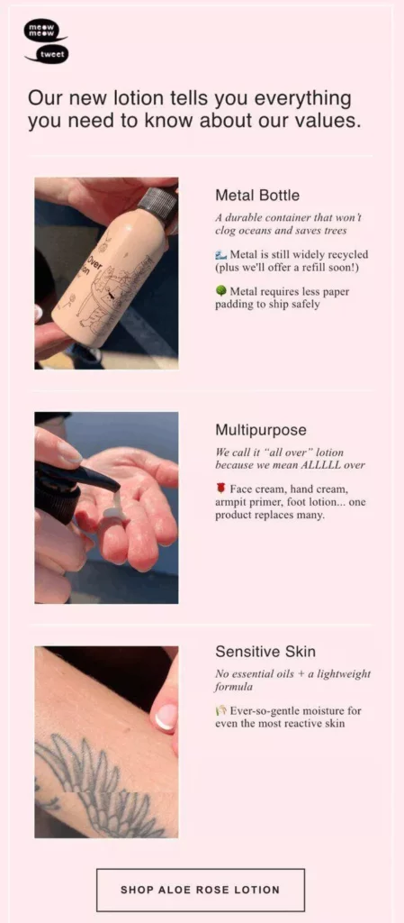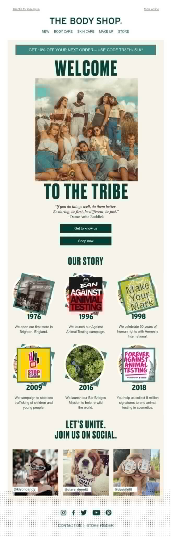 “我们对他们”的邮件在正确应用时可以非常有效。有一种方法可以围绕一个反派构建叙事,同时不过于低俗。想想你的品牌反对谁——对于化妆品公司来说,可能是大型美容或大型制药公司。通过利用这种对立关系,你可以团结你的客户群体,支持你所代表的一切。