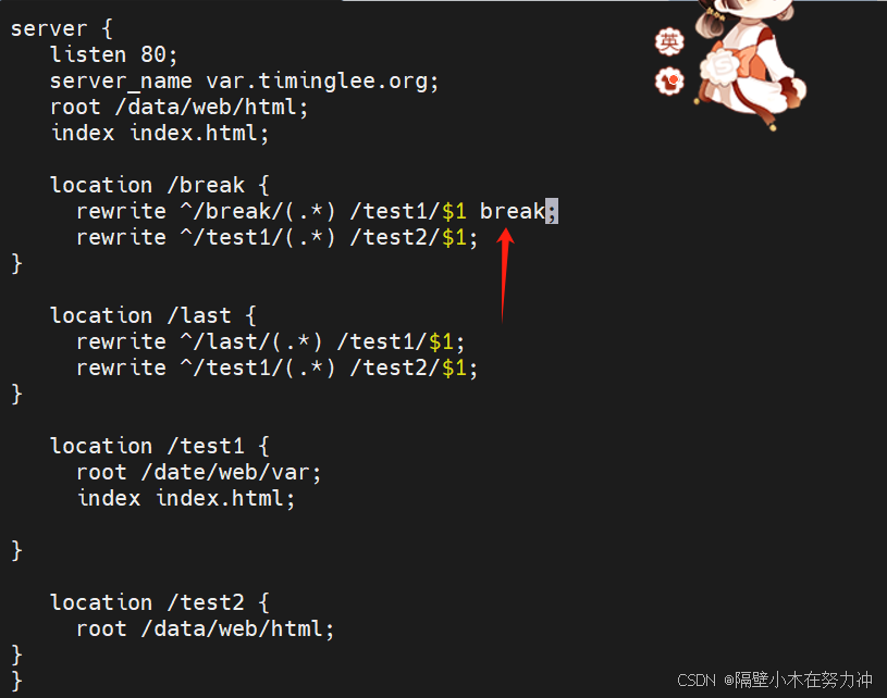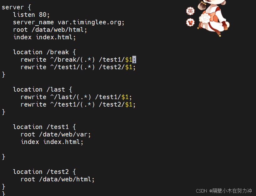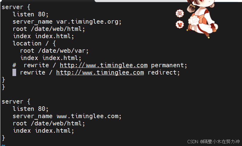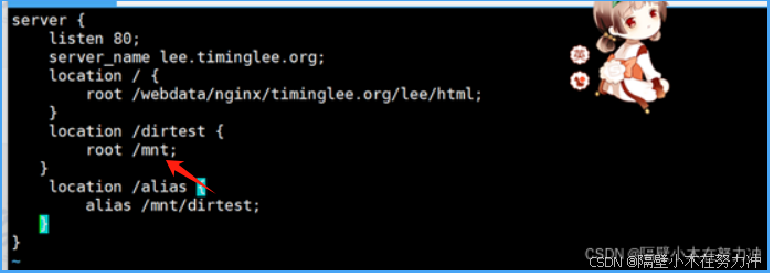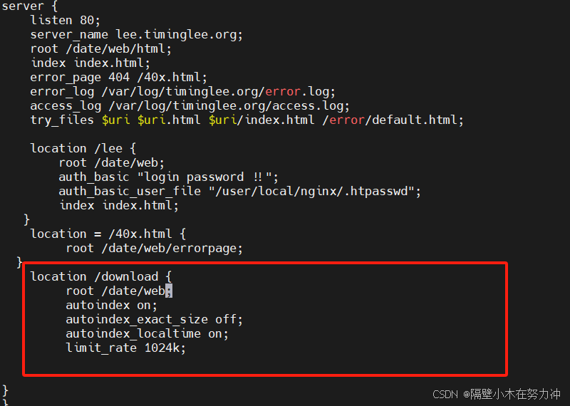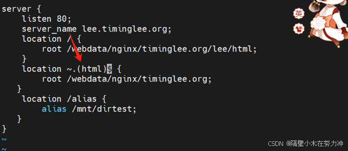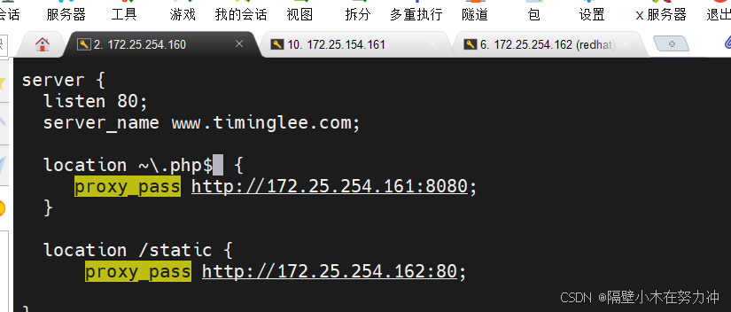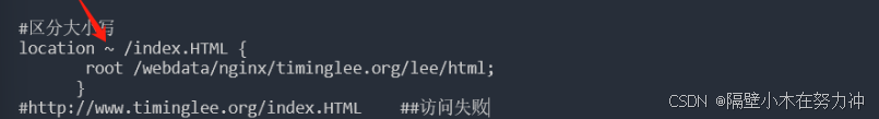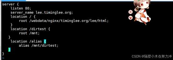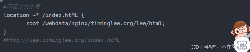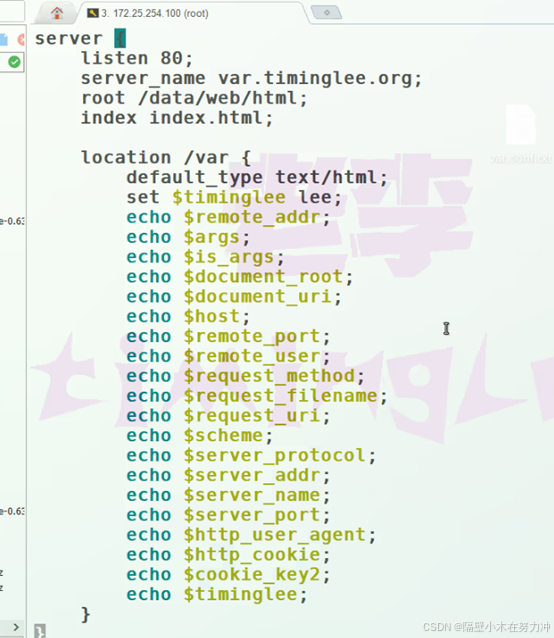 server {listen 80;server_name www.timinglee.com;root /data/php;location ~ \.php$ {fastcgi_pass 127.0.0.1:9000;fastcgi_index index.php;include fastcgi.conf;}}