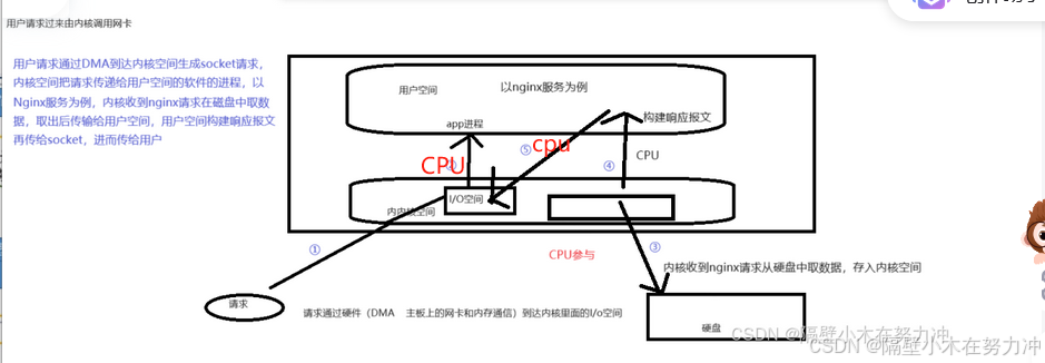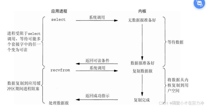***当用户进程调用了方法,那么此进程会被阻塞,内核会监视进程处理多个I/Od的各个socket,如果内核从磁盘中获取数据,方法会返回一个信息,此时用户进程载调用read操作,将数据从内核考入用户进程