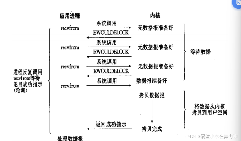 ***用户线程发起IO请求时立即返回。但并未读取到任何数据,用户线程需要不断地发起IO请求,直到数据 到达后,才真正读取到数据,继续执行。过于频繁的重试,干耗CPU而已,是比较浪费CPU的方式