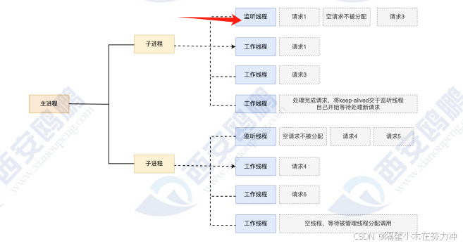 所以event模型在每个子进程中增加了监听线程,真实请求过来,把请求分发给服务线程,空请求不被分配处理,要是长连接,就由监听线程监听,不会占用服务线程资源,增加了高并发处理能力