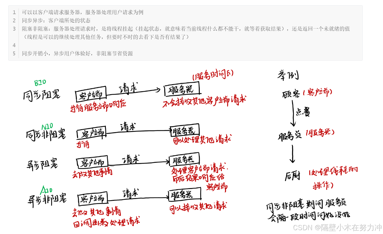 ***异步I/O 与 信号驱动I/O最大区别在于,信号驱动是内核通知用户进程何时开始一个I/O操作,而异步I/O 是由内核通知用户进程I/O操作何时完成,两者有本质区别,相当于不用去饭店场吃饭,直接点个外卖,把 等待上菜的时间也给省了