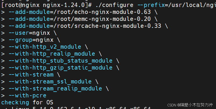 [root@Nginx nginx]# cd nginx-1.26.1/[root@Nginx nginx-1.26.1]# ./configure --add-module=/root/echo-nginx-module-0.63.tar.gz with-http_ssl_module --withhttp_v2_module--with-http_realip_module --with-http_stub_status_module --withhttp_gzip_static_module--with-pcre --with-stream --with-stream_ssl_module --