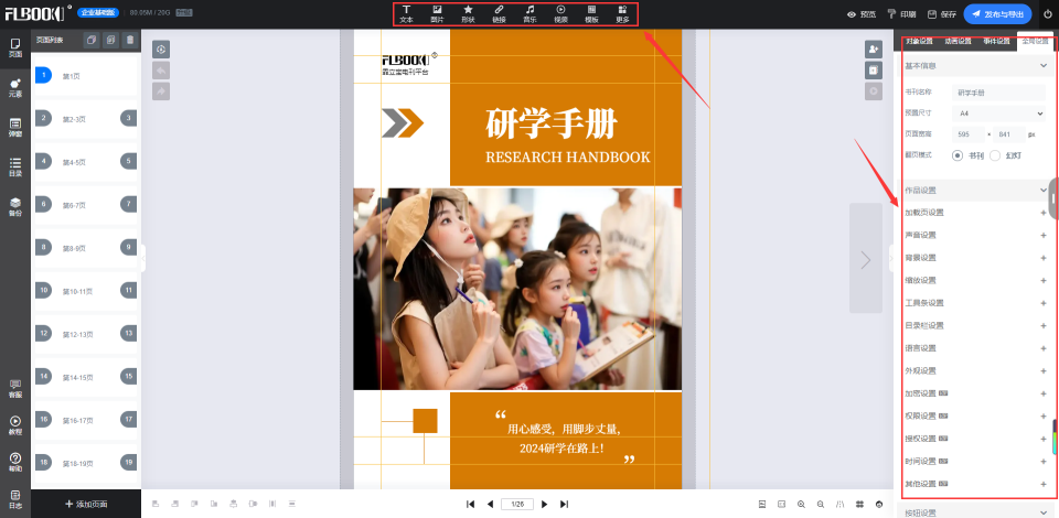 3.进入编辑页面只需要将模板进行简单的修改,即可制作出完美的企业画册了,还能添加动画、音频、视频等互动素材
