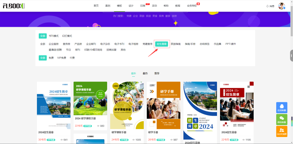 2.点击模板选择招生简章,用户可以按照各自的需求选择不同的招生简章模板进行使用