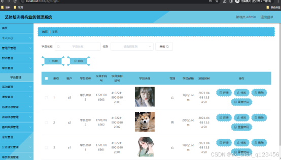 如图5.1显示的就是学员信息管理页面,此页面提供给管理员的功能有:学员信息的查询管理,可以删除学员信息、修改学员信息、新增学员信息,