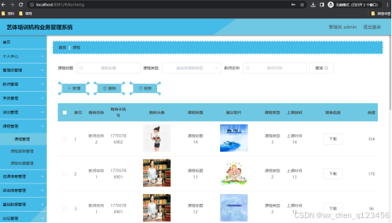 如图5.2显示的就是课程信息管理页面,此页面提供给管理员的功能有:查看已发布的课程信息数据,修改课程信息,课程信息作废,即可删除,还进行了对课程信息名称的模糊查询 课程信息信息的类型查询等等一些条件。