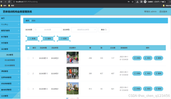 如图5.3显示的就是活动信息管理页面,此页面提供给管理员的功能有:根据活动信息进行条件查询,还可以对活动信息进行新增、修改、查询操作等等。