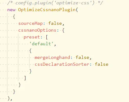 module.exports={configureWebpack:config =>{return {plugins:[new OptimizeCssnanoPlugin({sourceMap: false,cssnanoOptions: {preset: ['default',{mergeLonghand: false,cssDeclarationSorter: false}]},}),]}}
