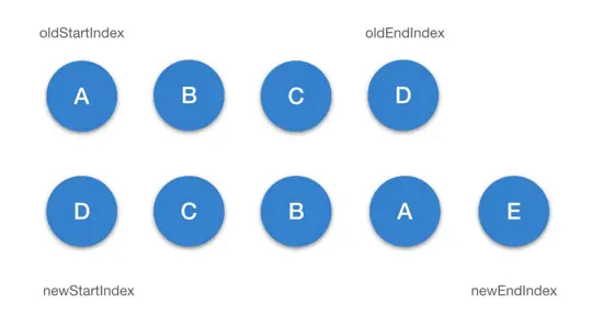 经过旧头新头、旧尾新尾、旧头新尾、旧尾新头四次交叉比对后,都没有匹配到值得比对的节点,这时如果新节点有key的话。可以通过map直接获得值得对比的旧节点的下标,如果没有key的话,就要通过循环旧节点数组用sameVnode方法判断新节点和该旧节点是否值得比较,值得就返回该旧节点的下标。显然通过map比通过循环数组的计算速度来的快。