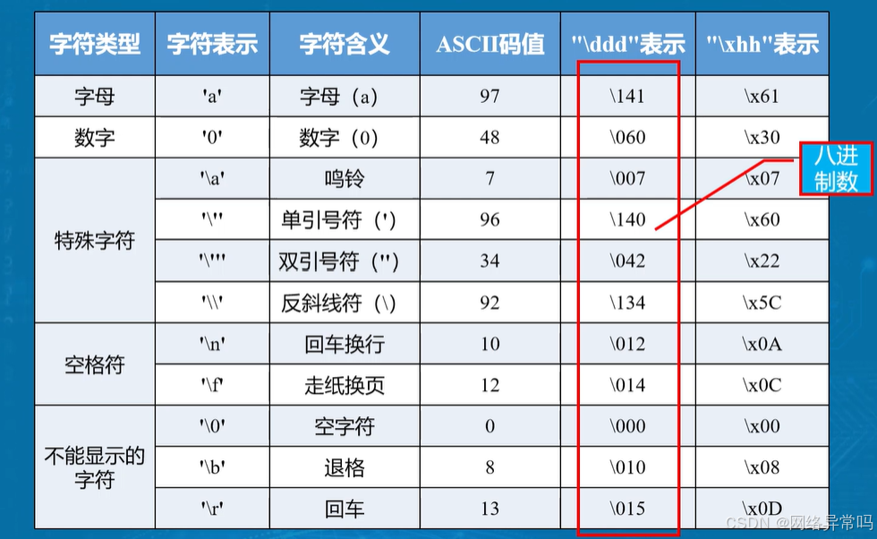 - 字符常量的值就是该字符的ASCII码值。一个字符常量在内存中只占一个字节。