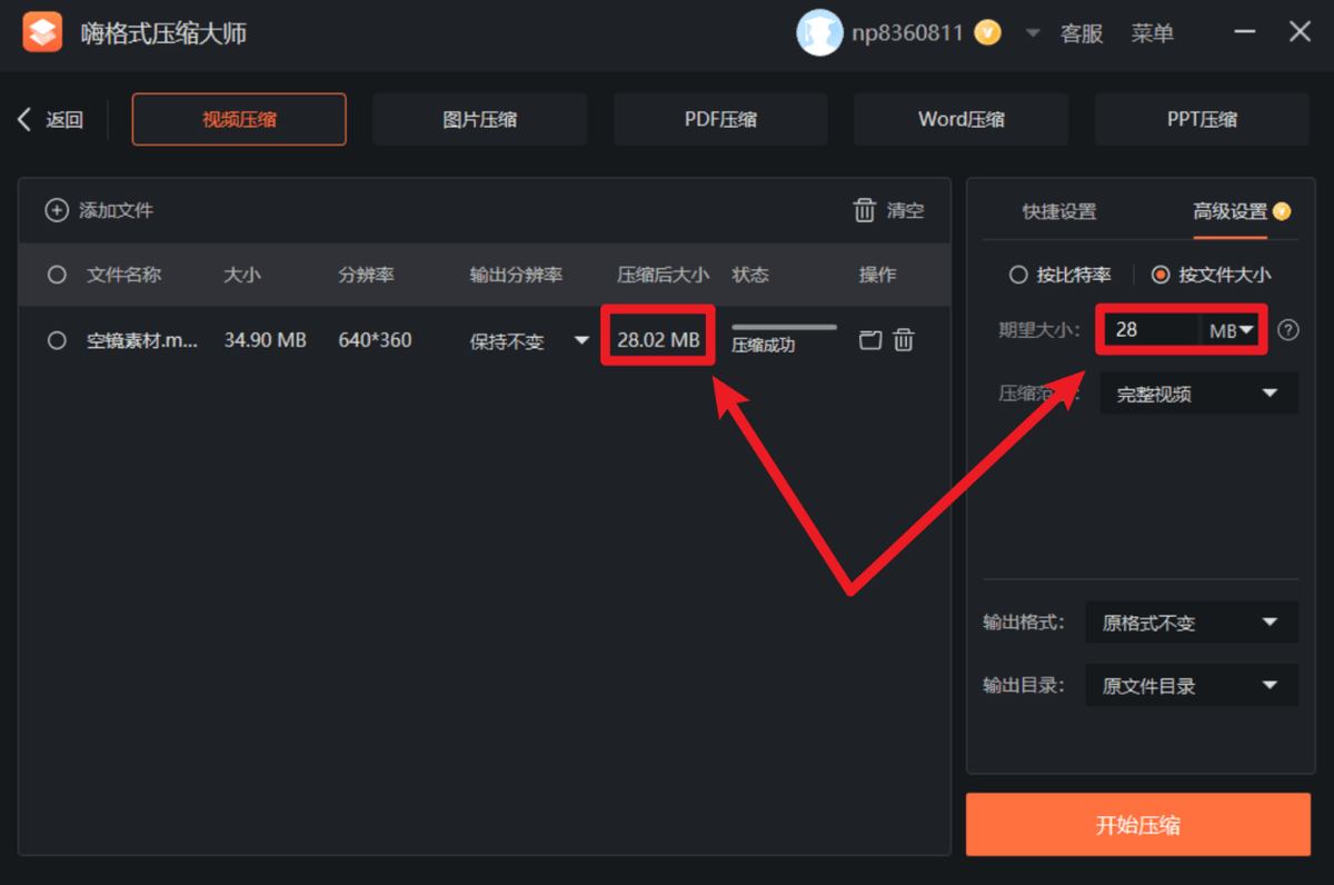 打开网页后,上传视频,接着可以输入指定视频大小进行压缩,开始压缩后等待片刻,完成后即可下载。该网站支持多种视频格式,如 MP4、MOV、AVI、WEBM 等,压缩时间在 1 分钟内,且支持批量压缩,同时指定视频压缩大小的误差小于 1MB。