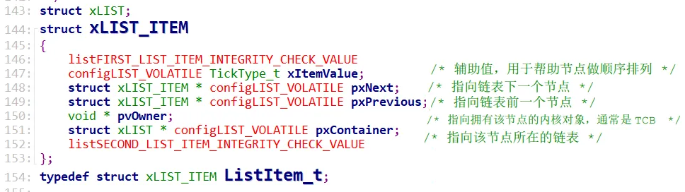 - xListEnd:链表是首尾相连的,是一个圈,首就是尾,尾就是首,从字面上理解就是链表的最后一个节点,实际上也是链表的第一个节点。数据类型是一个精简的节点。