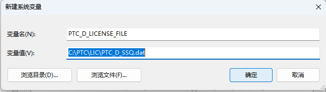 第十二步:变量名:PTC_D_LICENSE_FILE,然后点浏览文件,打开 PTC_D_SSQ.dat。