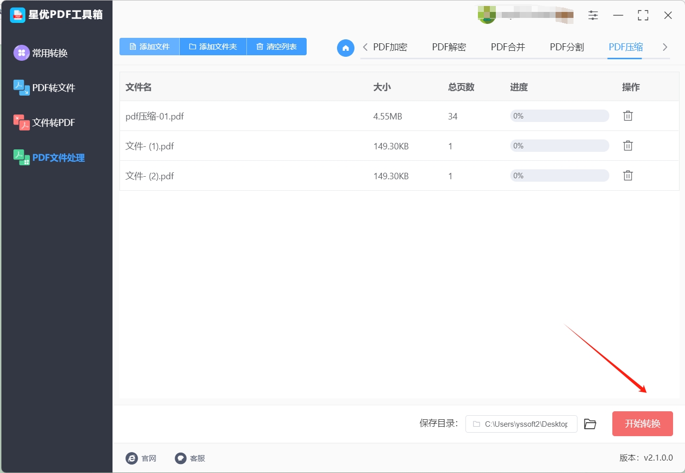 步骤三,在选中的PDF文件成功的上传至软件界面中之后,点击“开始转换”按钮,启动一下软件界面中的压缩程序。