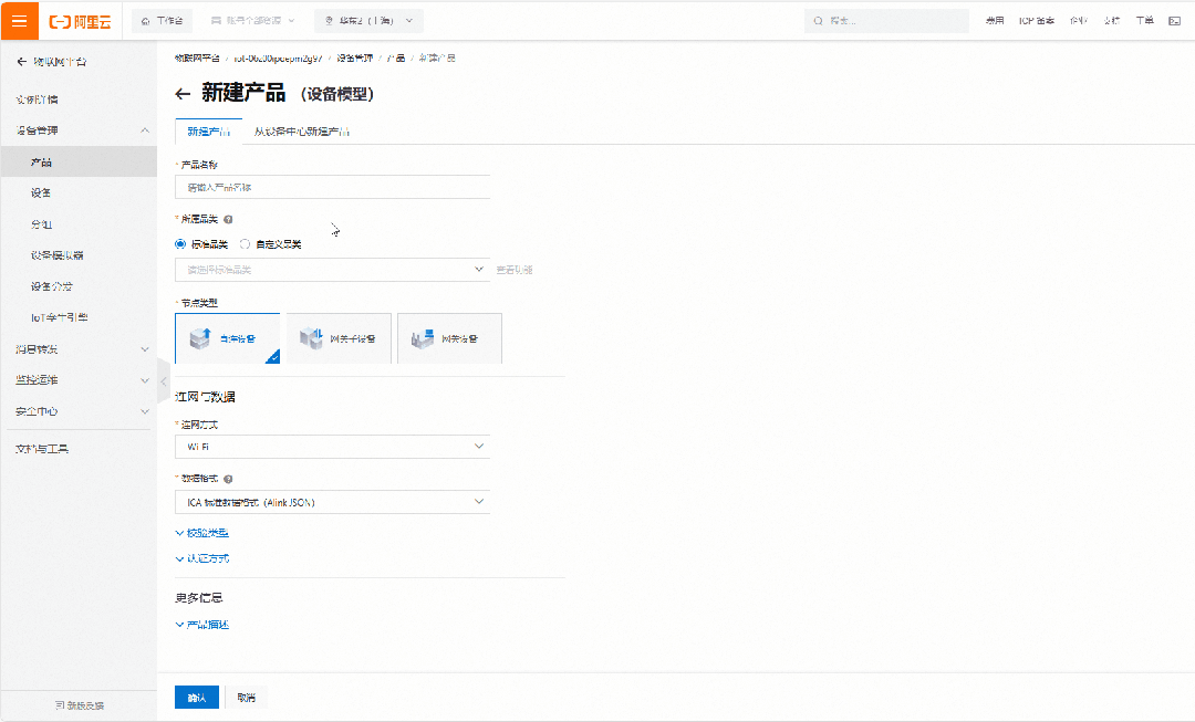 点开设备管理的产品页面,点击新建产品,根据需求和图示说明创建产品。