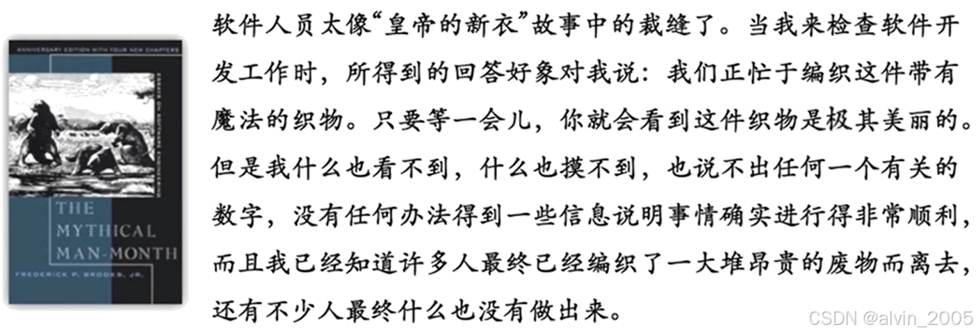 由于软件是一种“看不见、摸不着”的逻辑实体,不具有空间的形体特征。虽然开发人员可以直接看到程序代码,但源代码并不等于软件本身;软件是以机器代码的形式运行,人们无法看到源代码的执行过程。难怪《人月神话》中把软件开发人员比作“皇帝的新衣”中的裁缝。