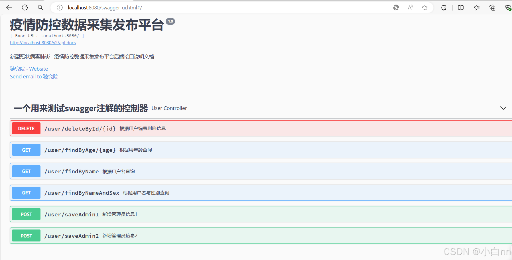 public class SwaggerConfig {/*** 创建API应用* apiInfo() 增加API相关信息* 通过select()函数返回一个ApiSelectorBuilder实例,用来控制哪些接口暴露给Swagger来展现,* 本例采用指定扫描的包路径来定义指定要建立API的目录。**/@Beanpublic Docket createRestApi() {return new Docket(DocumentationType.SWAGGER_2).apiInfo(apiInfo()).select().apis(RequestHandlerSelectors.basePackage("com.xn.springboot_swagger02.controller"))//扫描路径.paths(PathSelectors.any())//定义哪些路径的接口需要生成文档.build();}/*** 创建该API的基本信息(这些基本信息会展现在文档页面中)* 访问地址:http://项目实际地址/swagger-ui.html*/private ApiInfo apiInfo() {Contact contact = new Contact("猿究院", "http://www.apesource.com", "wangyanyi_enginner@163.com");return new ApiInfoBuilder().title("疫情防控数据采集发布平台")//文档首页标题.version("1.0")//文档版本.description("新型冠状病毒肺炎 - 疫情防控数据采集发布平台后端接口说明文档")//文档描述信息.contact(contact)//创建者信息.build();}}