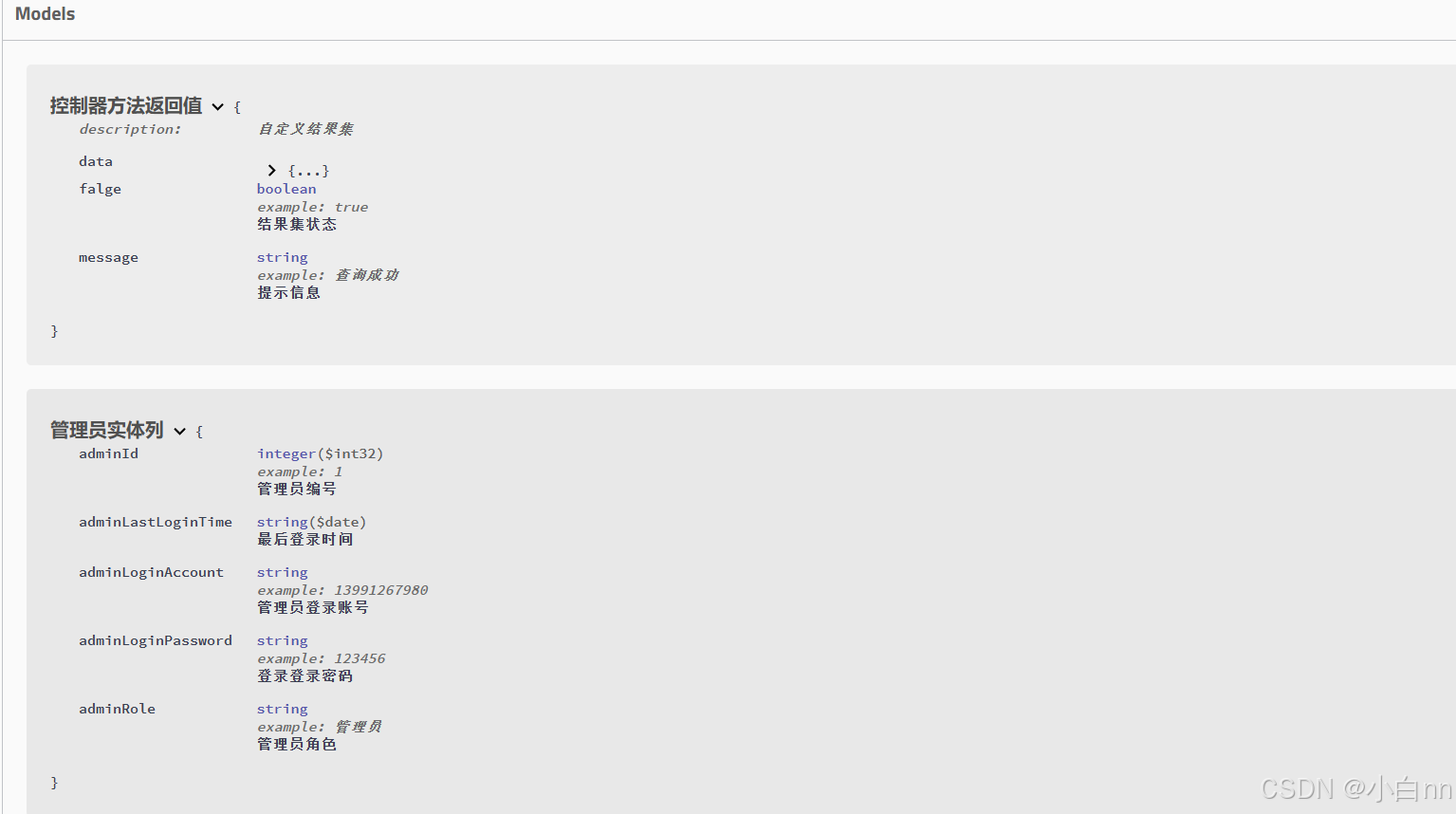 public class Admin {@ApiModelProperty(name = "adminId",value = "管理员编号",example = "001")private int adminId;//管理员编号@ApiModelProperty(name = "adminLoginAccount",value = "管理员登录账号",example = "13991267980")private String adminLoginAccount;//管理员登录账号(手机号码)@ApiModelProperty(name = "adminLoginPassword",value = "登录登录密码",example = "123456")private String adminLoginPassword;//登录登录密码(默认为手机号码后8位)@ApiModelProperty(name = "adminRole",value = "管理员角色",example = "管理员")private String adminRole;//管理员角色(超级管理员或普通管理员)@ApiModelProperty(name = "adminLastLoginTime",value = "最后登录时间")private Date adminLastLoginTime;//最后登录时间(2020年03月14日 15:30:40)}