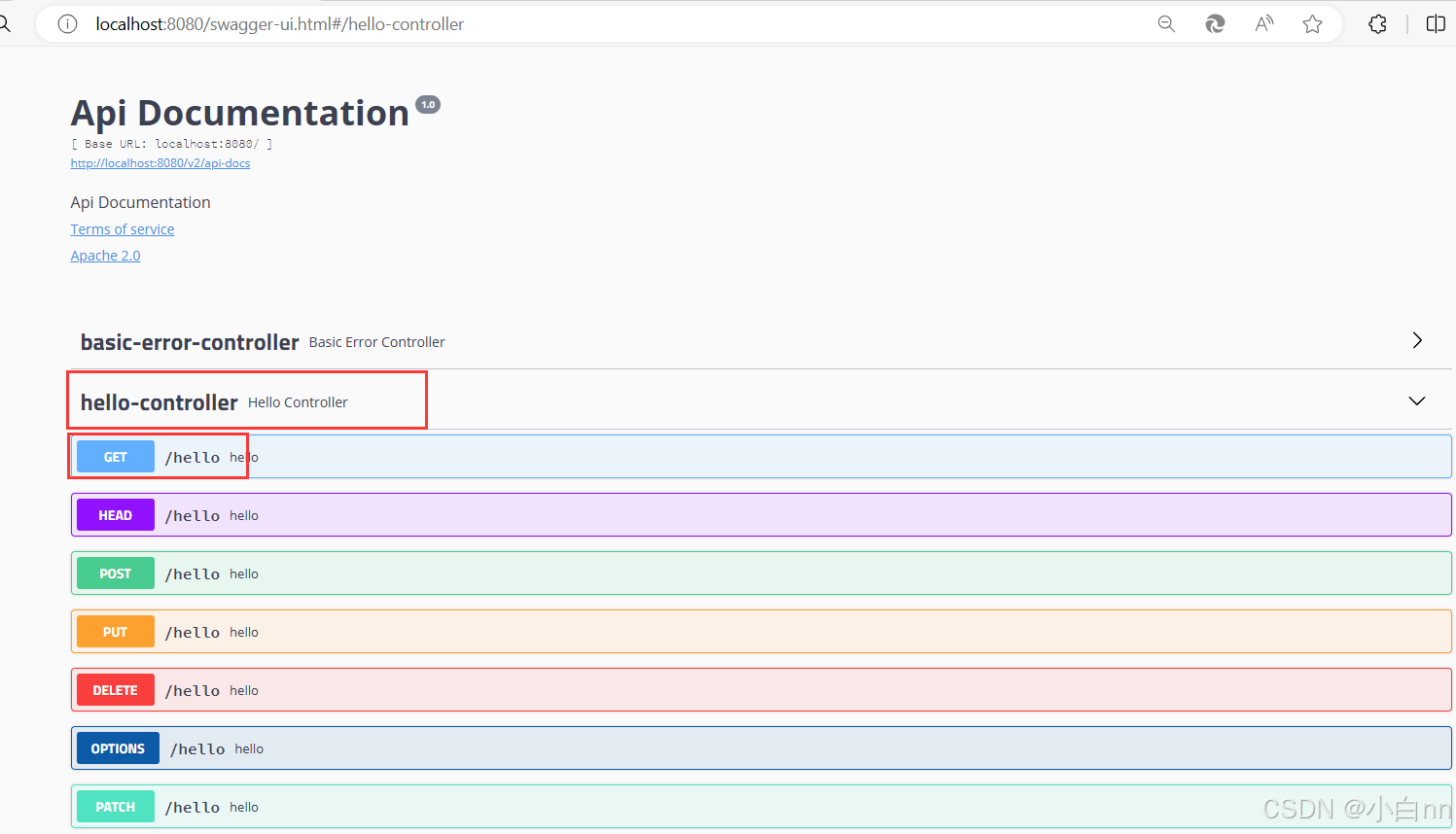 接", "联系人邮箱");return new ApiInfo("Swagger学习", // 标题"学习演示如何配置Swagger", // 描述"v1.0", // 版本"http://apesource.com", // 组织链接contact, // 联系人信息"Apach 2.0 许可", // 许可"许可链接", // 许可连接new ArrayList<>()// 扩展);