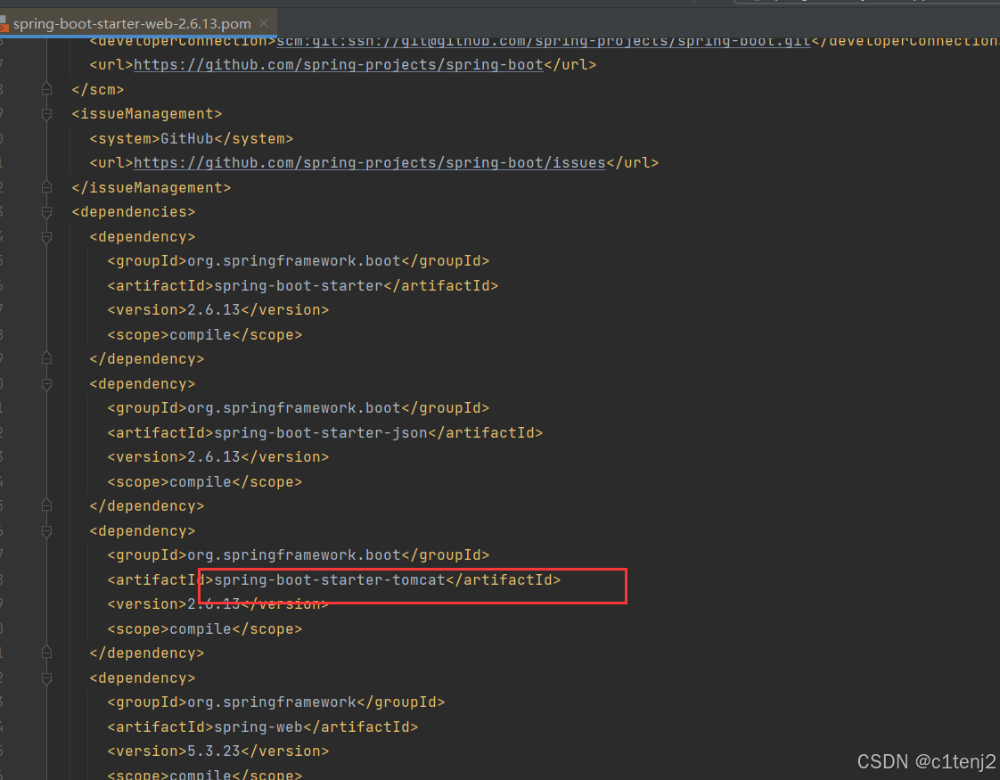 以spring-boot-starter-web举例,打开它,发现里面有一堆依赖,包括我们运行web项目需要的服务器——tomcat,这就是我们不需要配服务器也能正常运行web项目的原因。