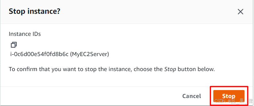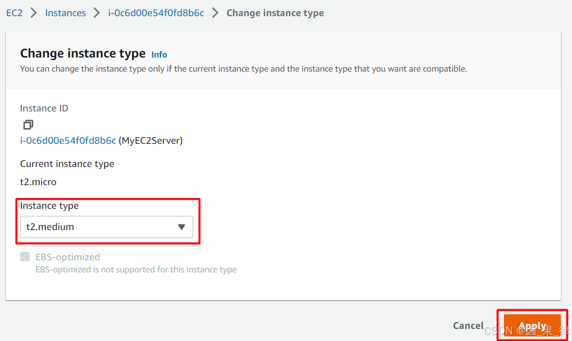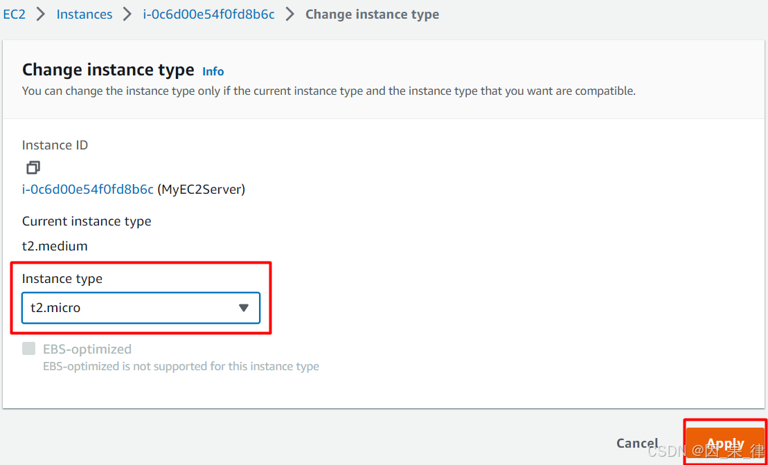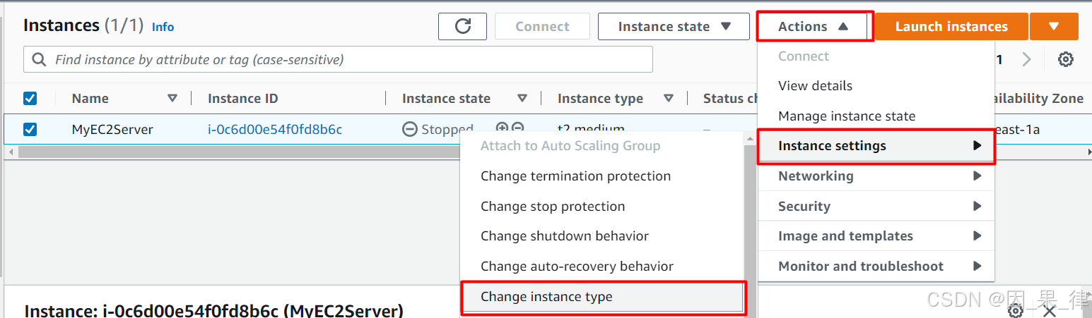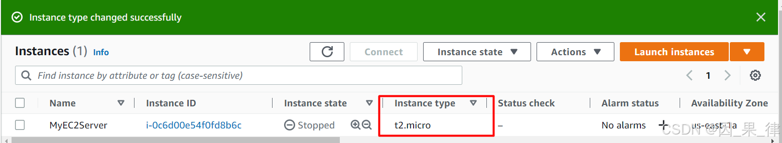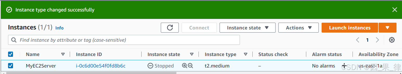由于无法在 EC2 实例处于运行状态时更改实例类型,因此我们需要先停止实例,然后才能更改实例类型。