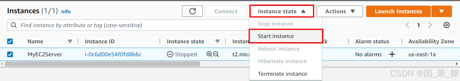 现在可以重新启动实例了。选择 EC2 实例,点击“实例状态”按钮下的“启动实例”。