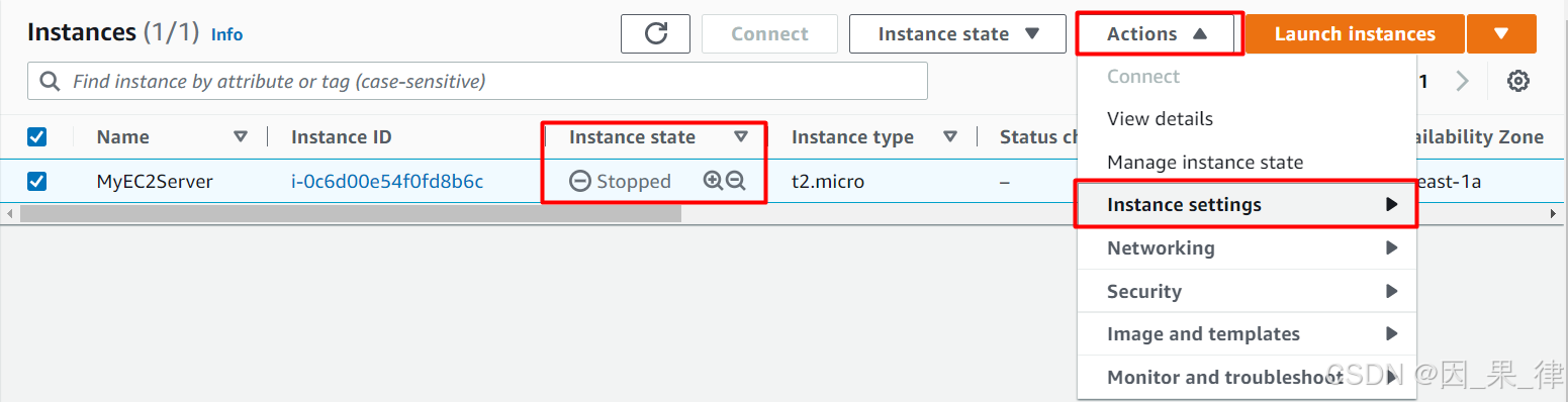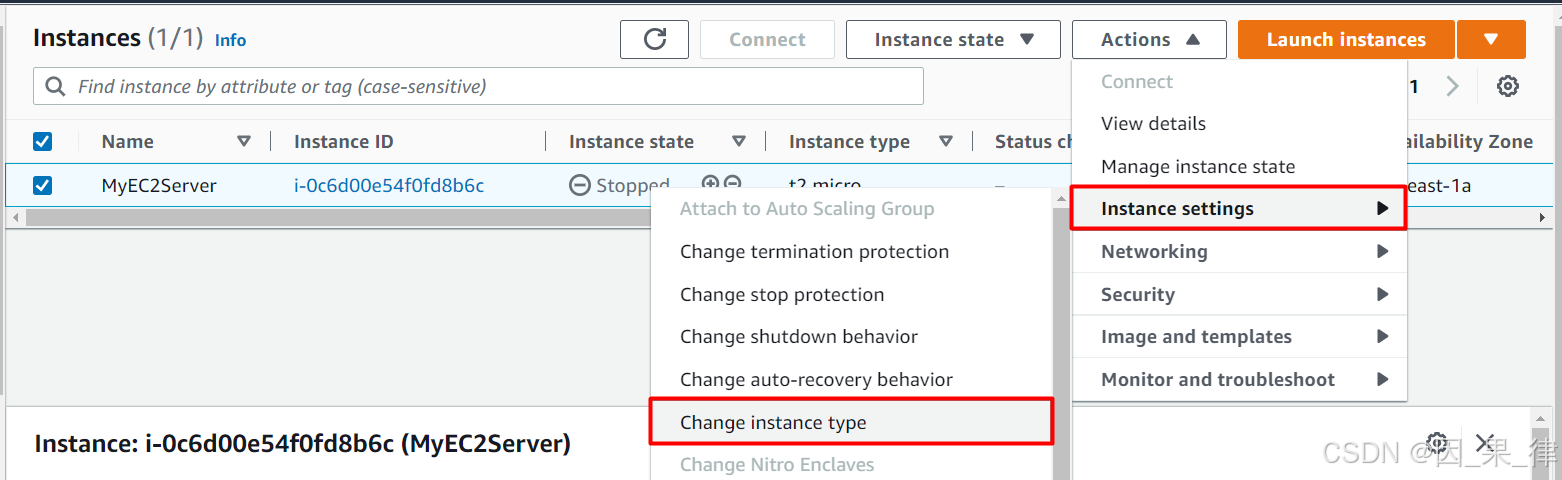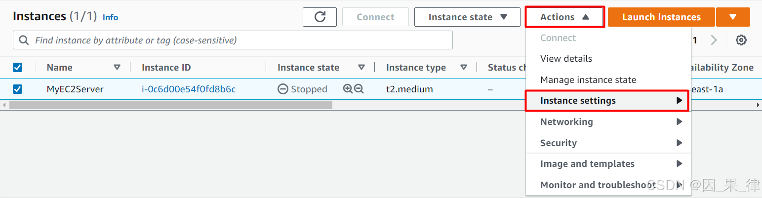 当 EC2 实例的状态变为“已停止”后,选择该 EC2 实例,然后点击“操作”按钮下的“实例设置”。