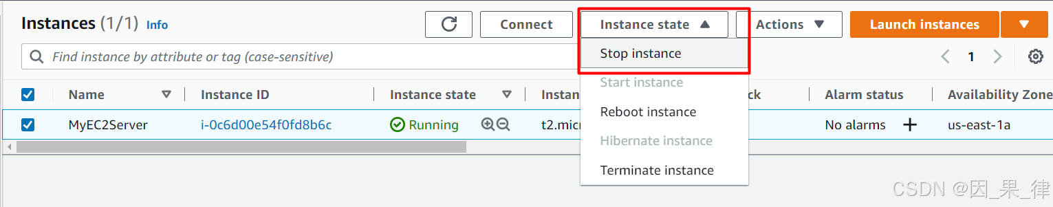 选择 EC2 实例,然后点击“实例状态”按钮下的“停止实例”。