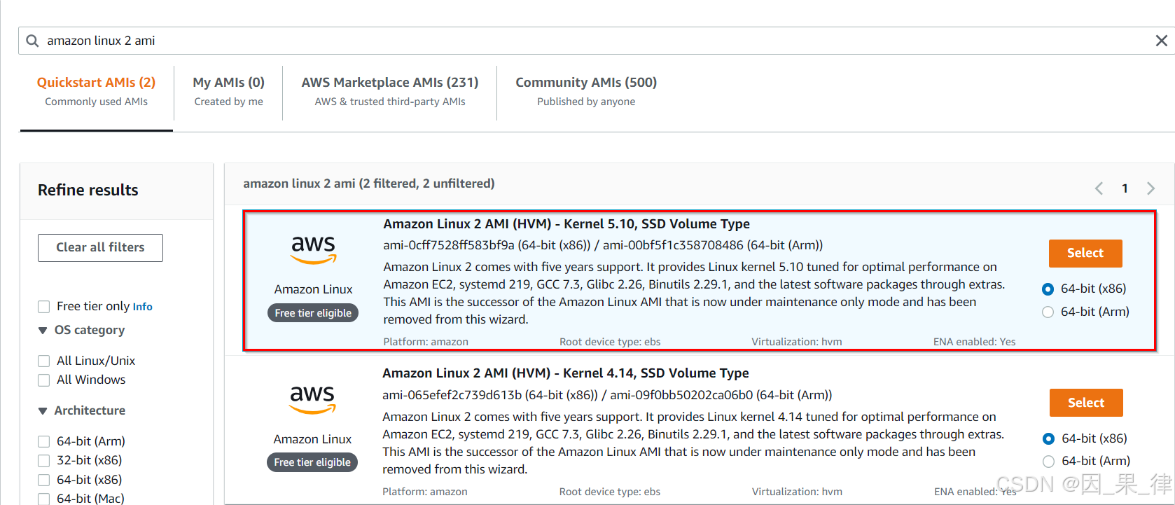 注意:如果出现了两个 Amazon Linux 2 AMI,请随意选择其中一个。