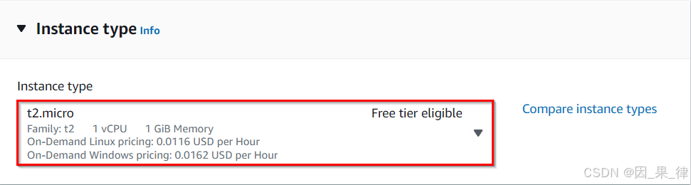 在实例类型下拉菜单中选择 t2.micro,然后点击“应用”按钮。