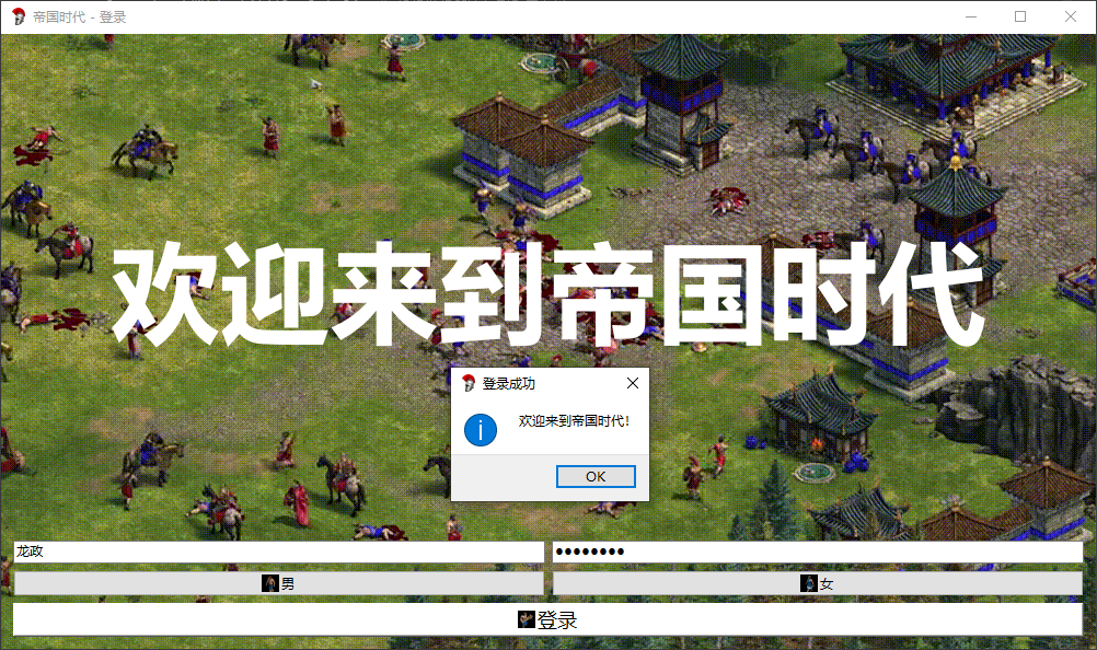 )class MyWidget(QWidget):def __init__(self):super().__init__()# 设置窗口大小、标题和图标self.resize(1366, 768) # 设置窗口大小为1366x768self.setWindowTitle("帝国时代 - 登录") # 设置窗口标题# 设置窗口图标,图标路径要保证正确self.setWindowIcon(QIcon("G:\\longz\\人工智能作业\\pictrue\\ReturnRome-AoEIcon.png"))# 创建垂直布局,用来垂直排列窗口中的组件layout = QVBoxLayout()# 创建标题标签并设置样式title_label = QLabel("欢迎来到帝国时代") # 创建一个标签显示标题title_label.setStyleSheet("font-size: 100px; font-weight: bold; color: white;") # 设置字体大小、粗体和字体颜色title_label.setAlignment(Qt.AlignmentFlag.AlignCenter) # 设置标题居中对齐layout.addWidget(title_label) # 将标题标签添加到垂直布局# 创建动图标签并显示动图age_gif = QLabel(self) # 创建一个标签用来显示GIF动画age_gif.resize(1366, 768) # 设置标签大小age_gif.setStyleSheet("background-color:green") # 设置背景色为绿色,便于调试# 加载并显示GIF动画mv = QMovie("G:\\longz\\人工智能作业\\2024年12月2日\\New_Settlement_Building_Set.gif")age_gif.setMovie(mv) # 设置动图为标签的内容mv.start() # 启动动图age_gif.setScaledContents(True) # 设置动图自适应标签大小# 创建水平布局,用于放置用户名和密码输入框input_layout = QHBoxLayout()# 创建用户名输入框self.username_input = QLineEdit() # 创建一个输入框self.username_input.setPlaceholderText("请输入用户名") # 设置占位文本input_layout.addWidget(self.username_input) # 将用户名输入框添加到水平布局中# 创建密码输入框self.password_input = QLineEdit() # 创建一个输入框self.password_input.setPlaceholderText("请输入密码") # 设置占位文本self.password_input.setEchoMode(QLineEdit.EchoMode.Password) # 设置输入内容为密码,隐藏输入的字符input_layout.addWidget(self.password_input) # 将密码输入框添加到水平布局中layout.addLayout(input_layout) # 将用户名和密码的水平布局添加到垂直布局中# 创建性别选择按钮的水平布局gender_layout = QHBoxLayout()male_button = QPushButton("男") # 创建男性按钮male_button.setIcon(QIcon("G:\\longz\\人工智能作业\\pictrue\\Returnofrome_male_villager_icon.png")) # 设置图标female_button = QPushButton("女") # 创建女性按钮female_button.setIcon(QIcon("G:\\longz\\人工智能作业\\pictrue\\Returnofrome_female_villager_icon.png")) # 设置图标gender_layout.addWidget(male_button) # 将男性按钮添加到布局中gender_layout.addWidget(female_button) # 将女性按钮添加到布局中layout.addLayout(gender_layout) # 将性别选择的水平布局添加到垂直布局中# 创建登录按钮login_button = QPushButton("登录") # 创建登录按钮login_button.setIcon(QIcon("G:\\longz\\人工智能作业\\pictrue\\Clubman.webp")) # 设置登录按钮图标login_button.setStyleSheet("background-color: white; color: black; font-size: 18px;") # 设置按钮的样式login_button.clicked.connect(self.handle_login) # 连接点击事件,触发登录函数layout.addWidget(login_button) # 将登录按钮添加到布局中# 设置窗口布局为垂直布局self.setLayout(layout)def handle_login(self):# 处理登录事件username = self.username_input.text() # 获取用户名输入框的文本password = self.password_input.text() # 获取密码输入框的文本# 判断用户名和密码是否正确if username == "龙政" and password == "Lz980806":# 如果用户名和密码正确,显示登录成功消息QMessageBox.information(self, "登录成功", "欢迎来到帝国时代!")else:# 如果用户名或密码错误,显示登录失败消息QMessageBox.warning(self, "登录失败", "用户名或密码错误,请重试!")if __name__ == "__main__":# 创建应用程序对象app = QApplication(sys.argv)# 创建MyWidget窗口对象myWidget = MyWidget()# 显示窗口myWidget.show()# 启动应用程序sys.exit(app.exec())