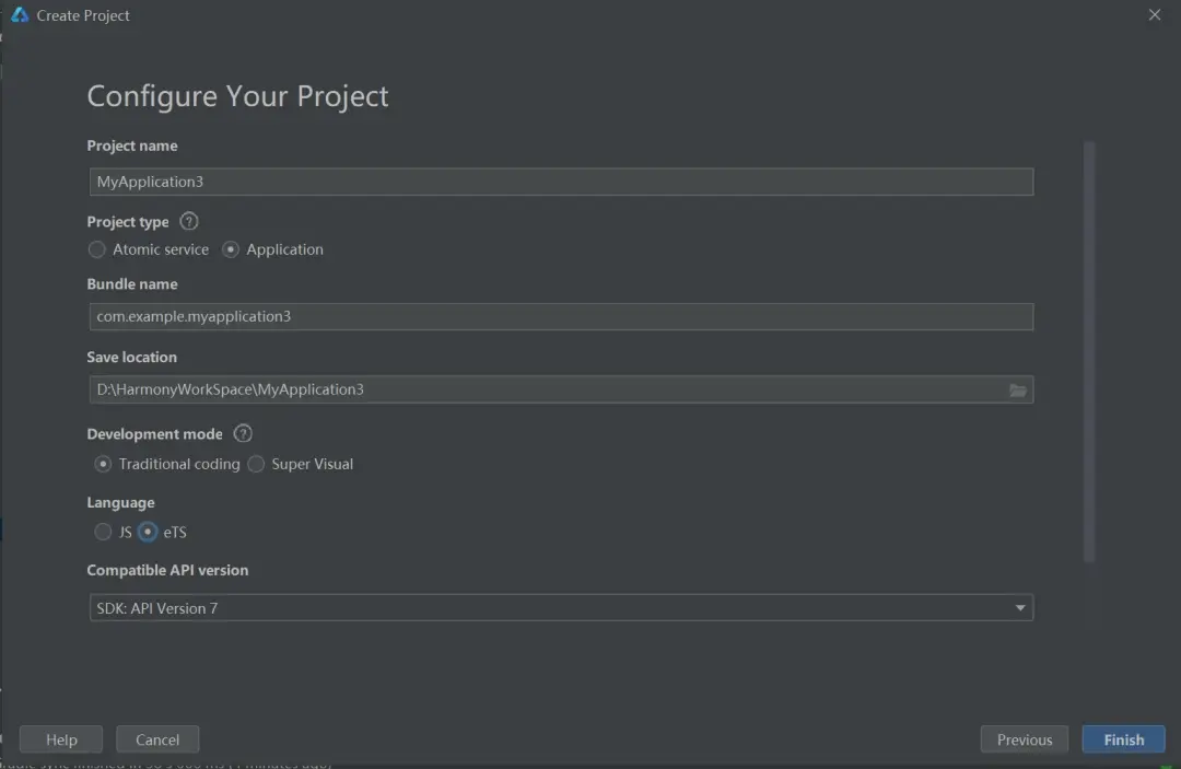 2.1.2 进入配置工程界面,Language 选择 eTS 语言,Project Type 选择 Application,其他参数根据实际需要设置即可,最后点击 Finish 即创建成功。