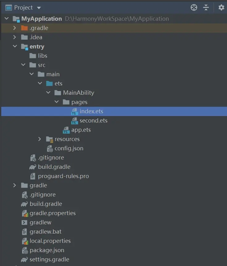 工程创建完成后,在 Project 窗口,点击“entry > src > main > ets > MainAbility > pages”,打开“index.ets”文件,项目结构如下图所示。