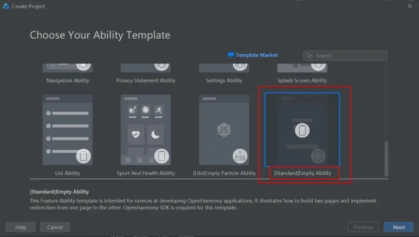 2.1.1 打开 DevEco Studio,创建一个新工程,在 DevEco Studio 中点击 File -> New Project,选择模板 Standard:Empty Ability。