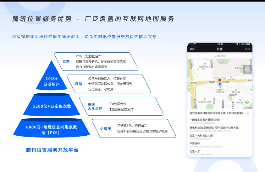 腾讯位置服务凭借其丰富的服务内容、先进的技术优势、广泛的生态合作和多样化的应用场景,致力于通过大数据、地图基础数据、位置服务生态、可视化引擎、云计算、人工智能、5G等互联网技术优势,为各行业提供全面的位置服务解决方案。