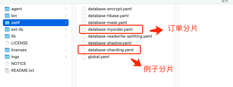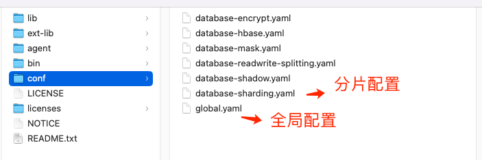 访问 下载页面,获取 ShardingSphere-Proxy 二进制安装包, 解压缩的文件目录如下: