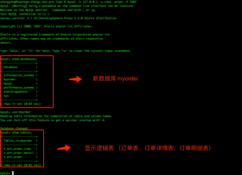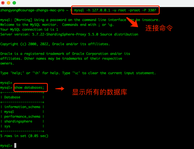然后使用 MySQL 终端命令连接 ShardingSphere-Proxy 服务端: