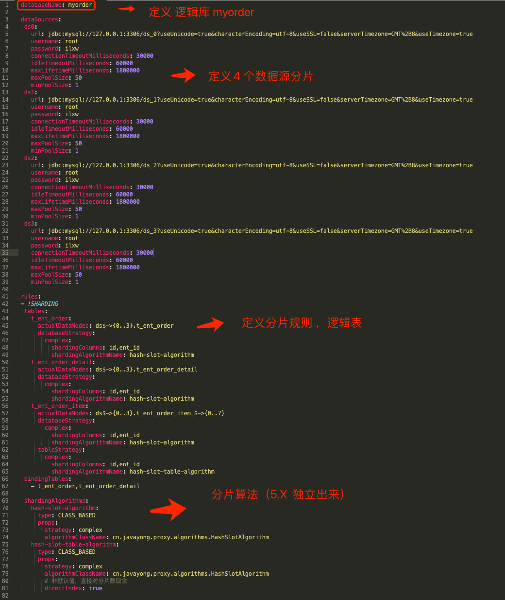 6、配置分片文件 database-myorder.yaml , 该文件用来定义订单的 4 个分片的路由策略;