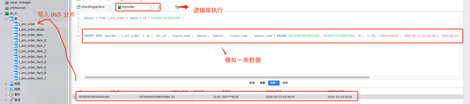 然后我们模拟在 myorder 逻辑数据库中新增一条订单记录,执行成功并且查询页正常的情况下,发现分片 ds0 中存储了刚插入的那条数据。