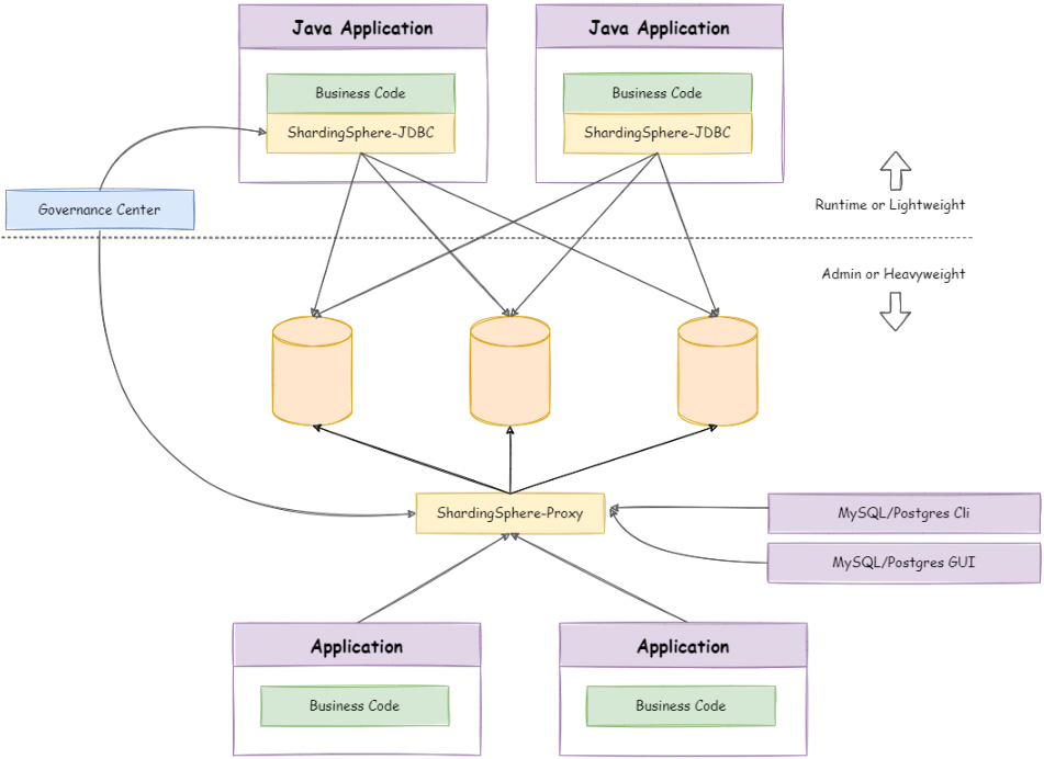 通过混合使用 ShardingSphere-JDBC 和 ShardingSphere-Proxy,并采用同一注册中心统一配置分片策略,能够灵活的搭建适用于各种场景的应用系统,使得架构师更加自由地调整适合于当前业务的最佳系统架构。